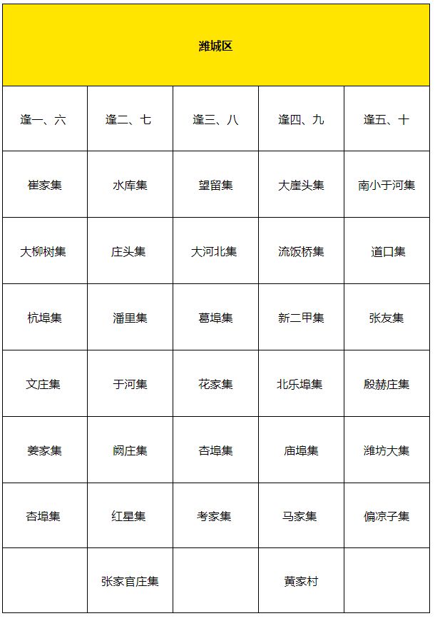 - 周一:潍城区南关街道、坊子区坊城街道 - 周二:潍城区北关街道、坊子区凤凰街道 - 周三:潍城区西关街道、坊子区新城街道 - 周四:潍城区东关街道、坊子区坊安街道 - 周五:潍城区南关街道、坊子区坊城街道 - 周六:潍城区北关街道、坊子区凤凰街道 - 周日:潍城区西关街道、坊子区新城街道