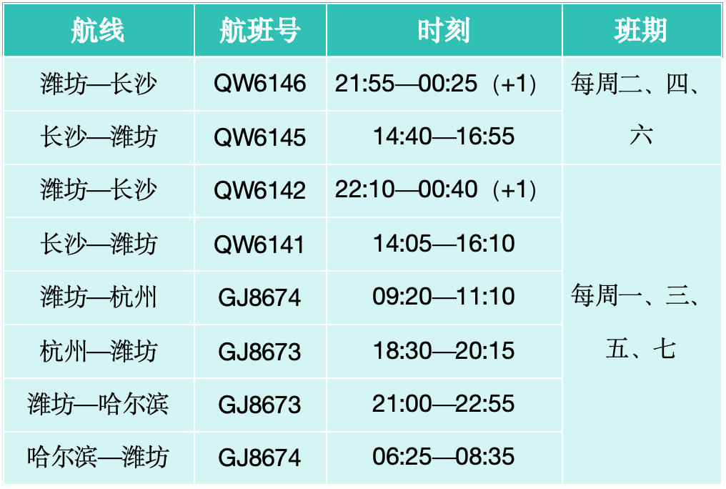 加密杭州=潍坊=哈尔滨航线,由每周三班加密为每周七班。