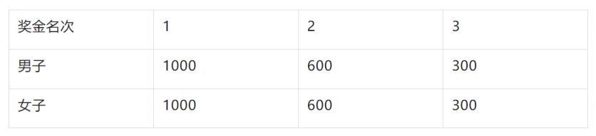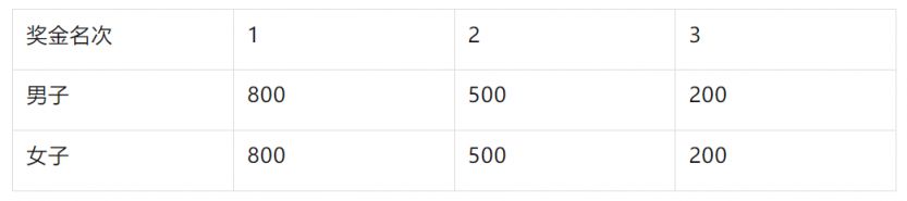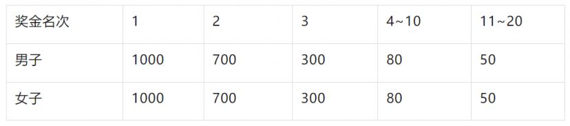 2. 女子组: - 冠军:人民币10万元 - 亚军:人民币5万元 - 季军:人民币3万元 - 第四名至第十名:人民币1万元