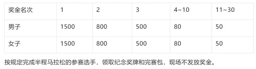 上述所有奖金将按照中国税法规定,需征收20%个人所得税,由运营方代扣;半程马拉松(包含视障人士)排名前三名选手以枪声成绩为准,其余全部以净成绩为准。获得半程马拉松男女前三名的运动员须现场参加颁奖仪式,否则视为自动放弃获奖资格,现场不发放奖金。获奖者名单将在官网公示十个工作日后,如无异议,奖金存入获奖选手本人银行卡,超期未提供银行卡信息者按弃奖处理,如发现并证实成绩存在作弊违规者,取消该运动员名次,后面名次不递补。