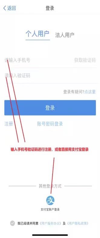 第三步:登录页面,选择个人用户,输入手机号码,输入验证码,或者通过支付宝登录,登录爱山东APP。