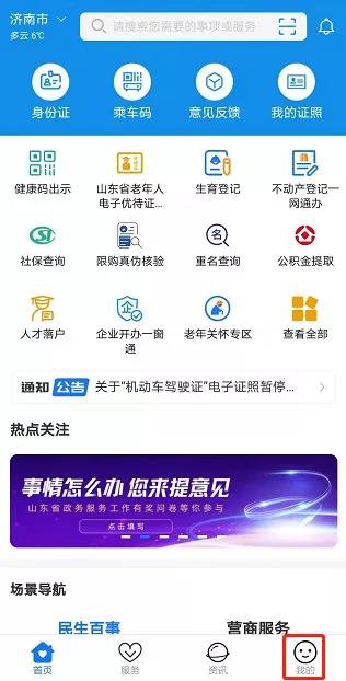 第一步:下载爱山东app,打开首页,点击右下角“我的”按钮。